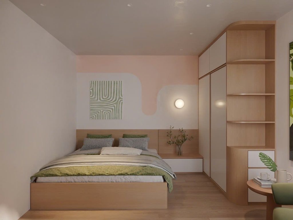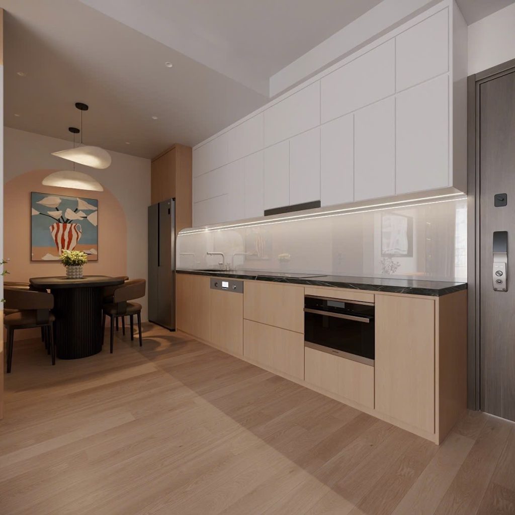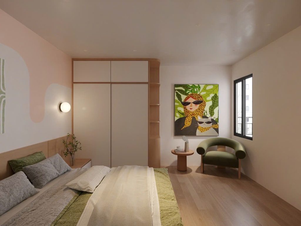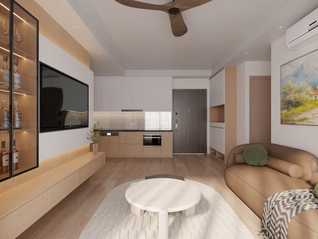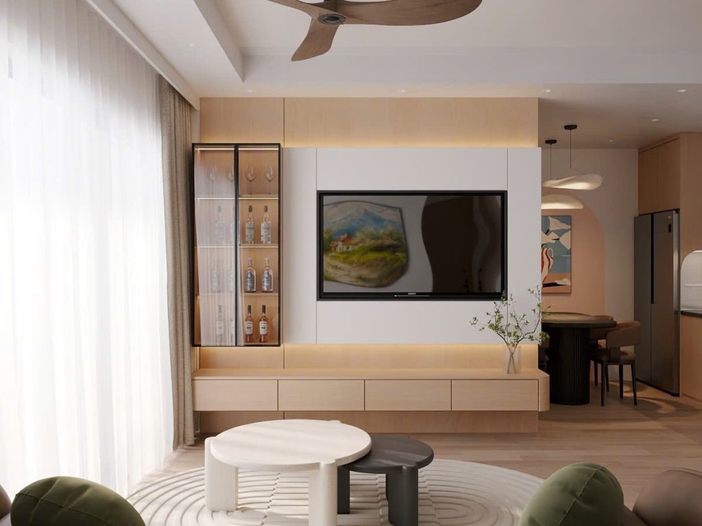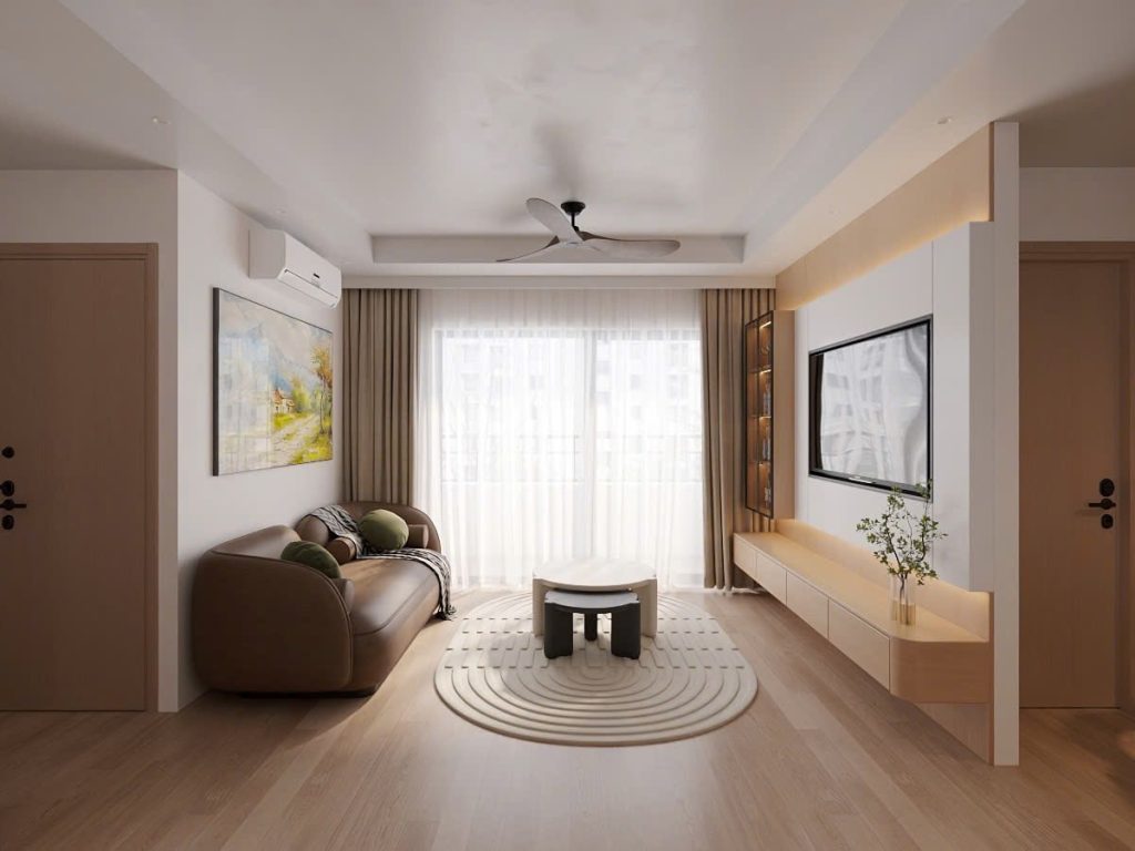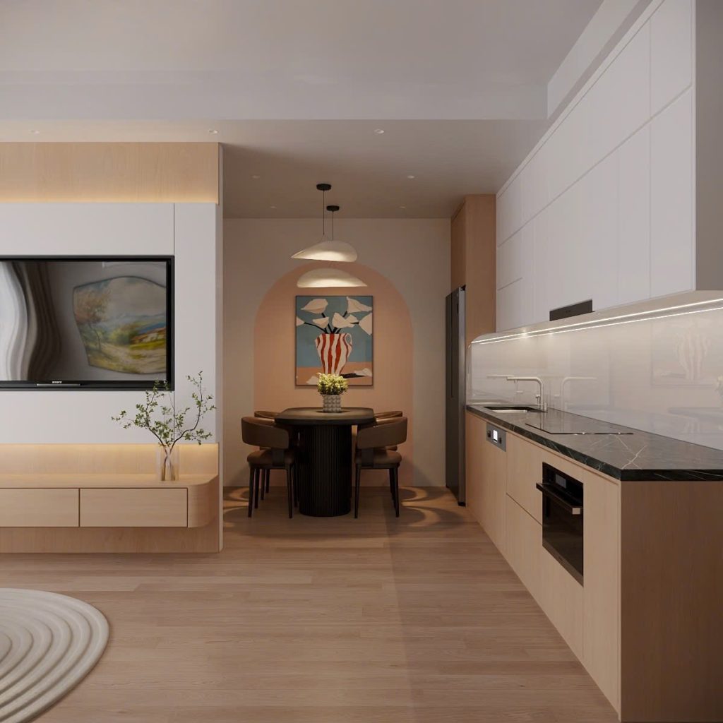 Tông màu trung tính như trắng – be – ghi sáng kết hợp cùng nội thất gỗ nhạt tạo cảm giác nhẹ nhàng, gần gũi.